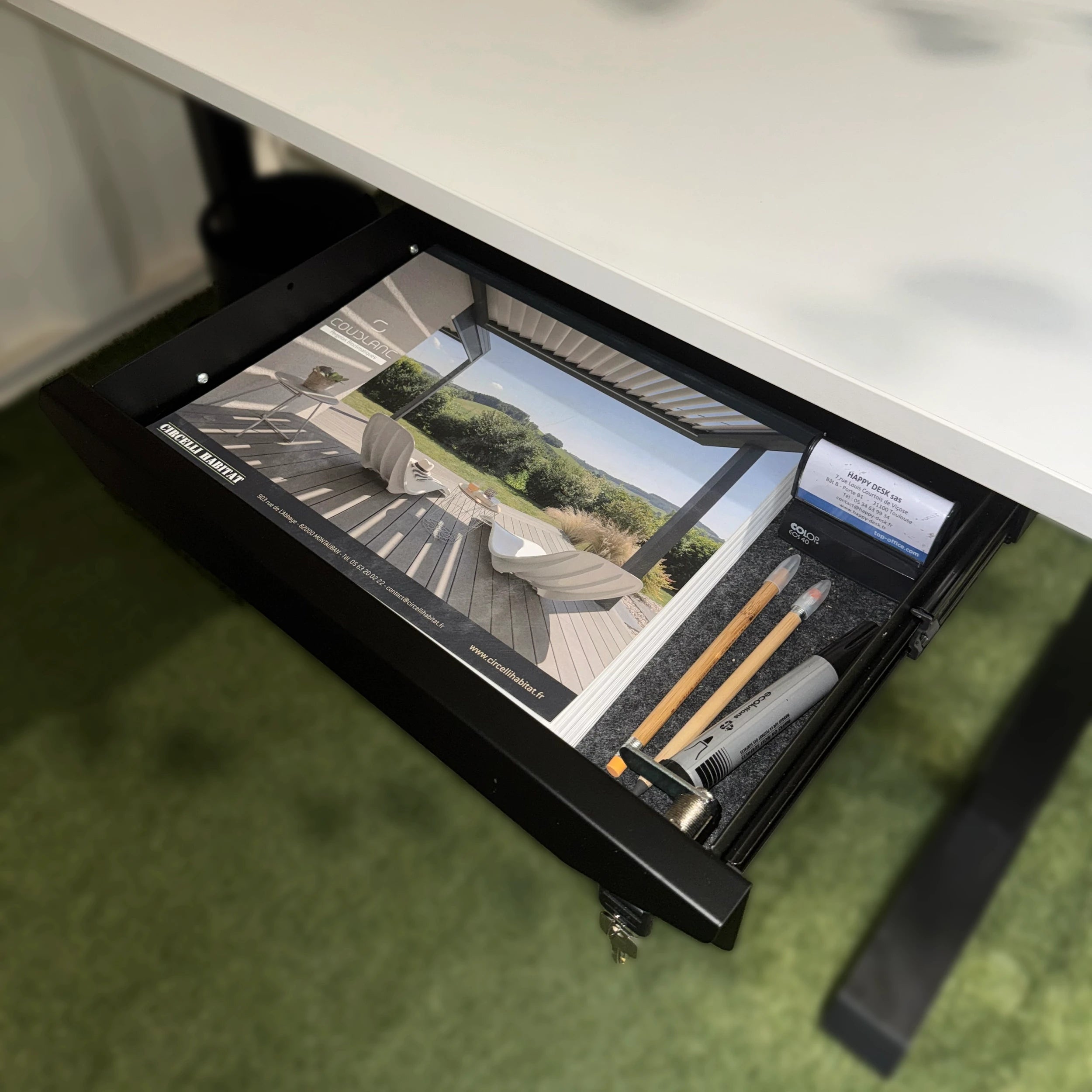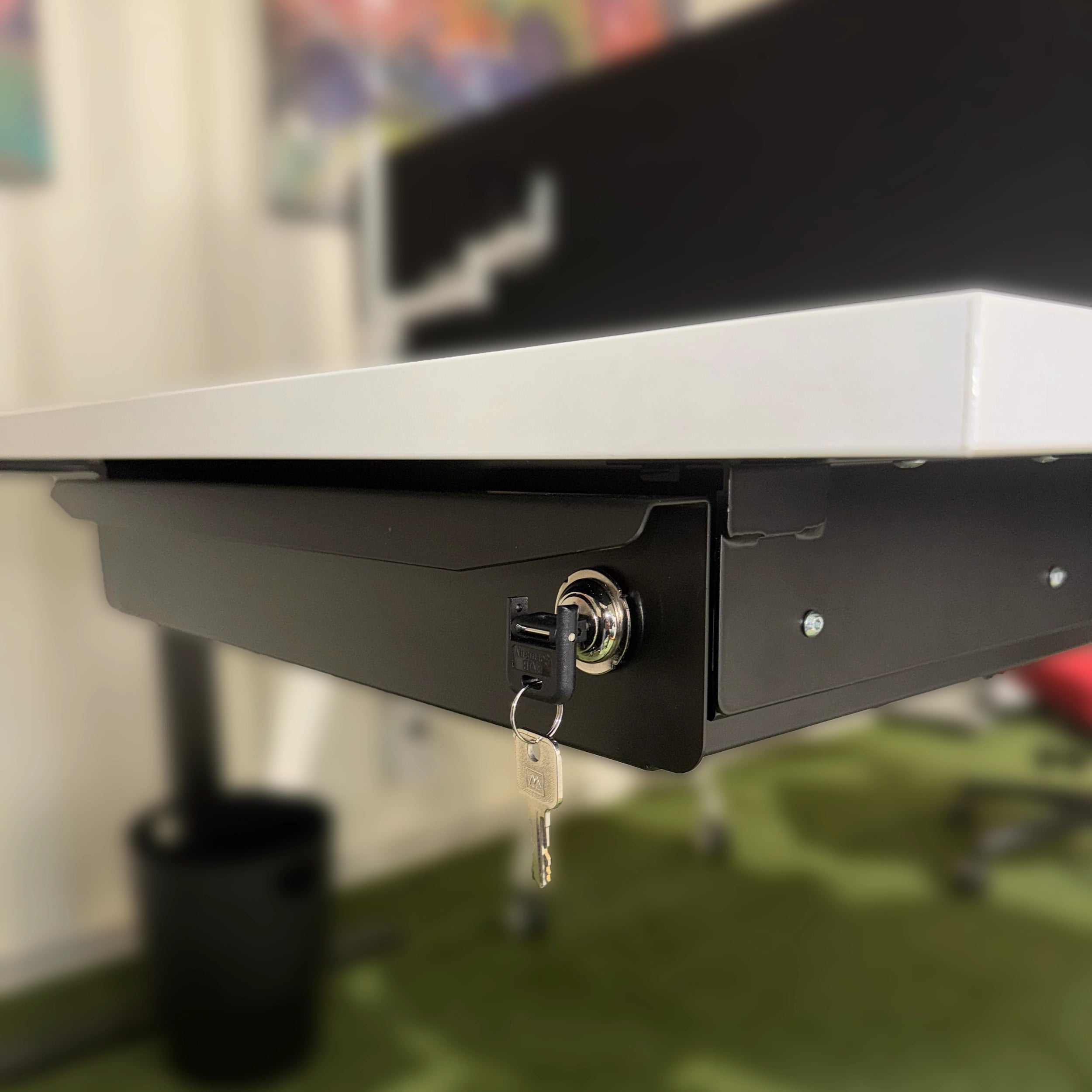 Ce Tiroir Universel est idéale pour un bureau Assis Debout. Il est facile à monter sous le plateau. Avec son incrustation de feutre et son verrou sécurisé, il offre un rangement sure et pratique avec une extension totale sur roulement à billes.